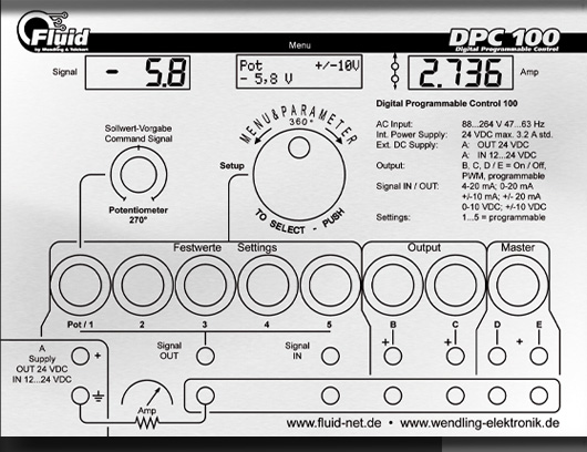 DPC100 Digital Proportional ControlMikroprozessorgesteuertes Testgerät für Proportionalventile mit externer Elektronik oder OBE. Sollwertausgabe entweder über Potentiometer oder über fünf Taster. Zwei zusätzliche Signalausgänge, die auch zur Ansteuerung von Schaltventilen genutzt werden können. Ein zusätzlicher nicht schaltbarer Ein- Ausgang für externe Stromversorgung in das Gerät (z.B. 12VDC) oder eines externen Geräts. - Programmierbare Festwerte über Wählradschalter mit zweizeiliger Menü- und Parameteranzeige.
